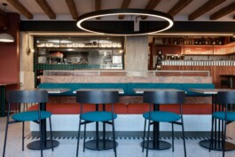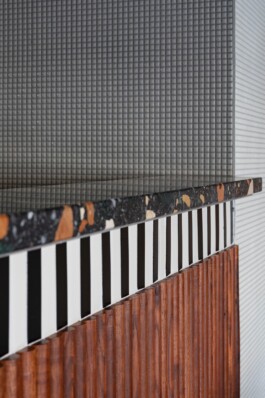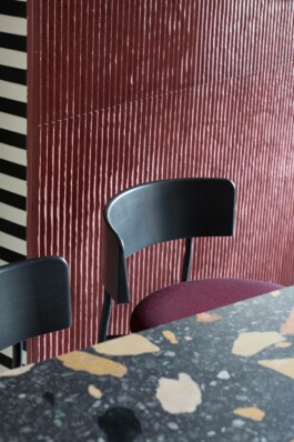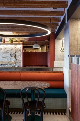 et un bistrot. Un lieu dans lequel, comme une évidence, matières et couleurs abondent sans pour autant singer l’ancien. Sur un air de Memphis, ici le terrazzo au sol n’existe pas ailleurs tandis que d’autres matériaux entament une seconde vie.