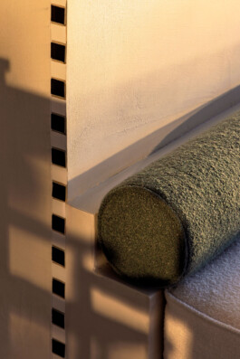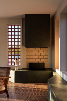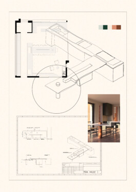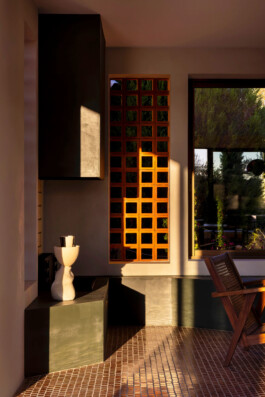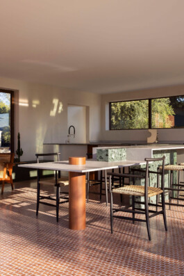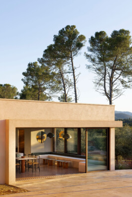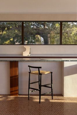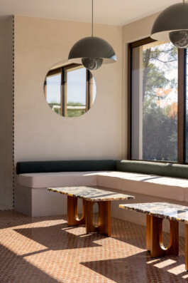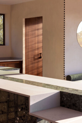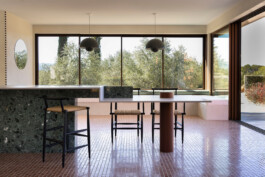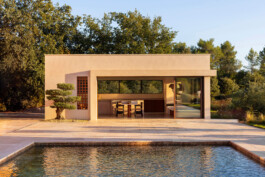 Face au massif de la Sainte-Victoire cher à Cézanne se dresse un pool house, extension moderne d’une maison provençale traditionnelle. Vu de l’extérieur, on pense à la Californie des années 50, tandis qu’une fois à l'intérieur, des airs d’une Venise version Olivetti se dégagent d'un décor graphique et épuré. Les pieds nus se baladent sur un terrazzo sur-mesure « à la Scarpa » et son marbre de Verone, frais et chaud à la fois. Conçu comme un lieu de convivialité et de rassemblement, grand ouvert sur l'extérieur Été comme Hiver, plusieurs assises se proposent en fonction des moments de vie. Au centre, la pièce maitresse, une table monumentale, massive et aérienne, faisant face à la piscine telle un plongeoir.
