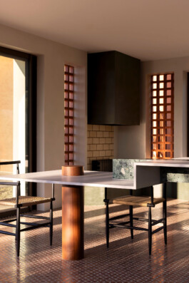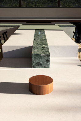 et son marbre de Verone, frais et chaud à la fois. Conçu comme un lieu de convivialité et de rassemblement, grand ouvert sur l'extérieur Été comme Hiver, plusieurs assises se proposent en fonction des moments de vie. Au centre, la pièce maitresse, une table monumentale, massive et aérienne, faisant face à la piscine telle un plongeoir.