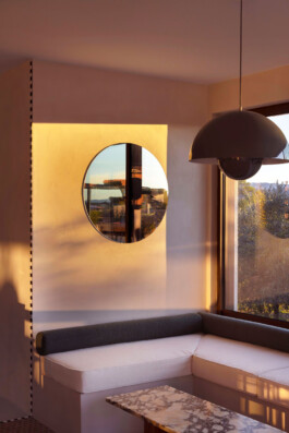 Vu de l’extérieur, on pense à la Californie des années 50, tandis qu’une fois à l'intérieur, des airs d’une Venise version Olivetti se dégagent d'un décor graphique et épuré.